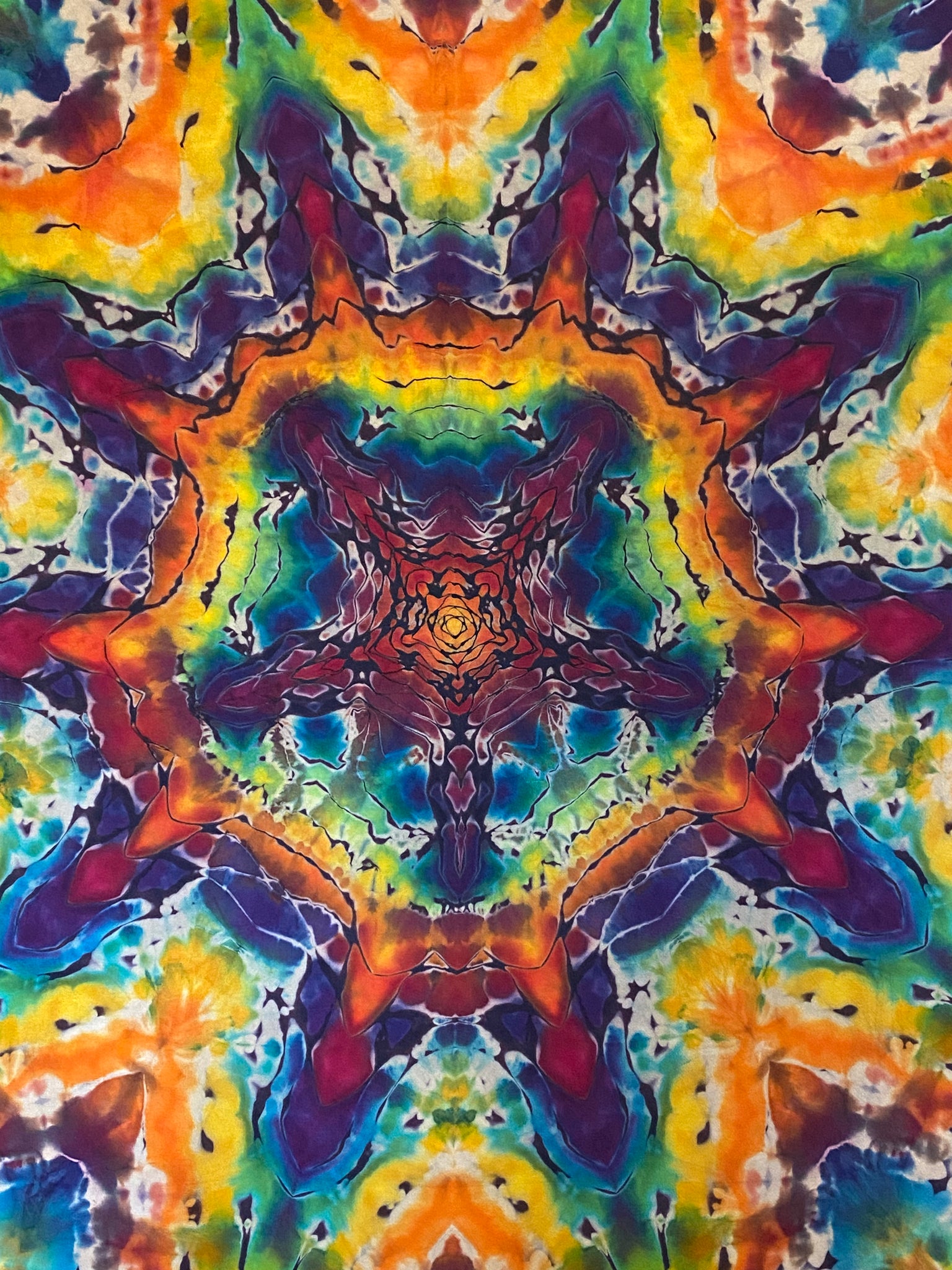 5 point into a 10 point mandala. Hemmed edges. Custom cloth hanging loops One corner with one inch rip repaired.