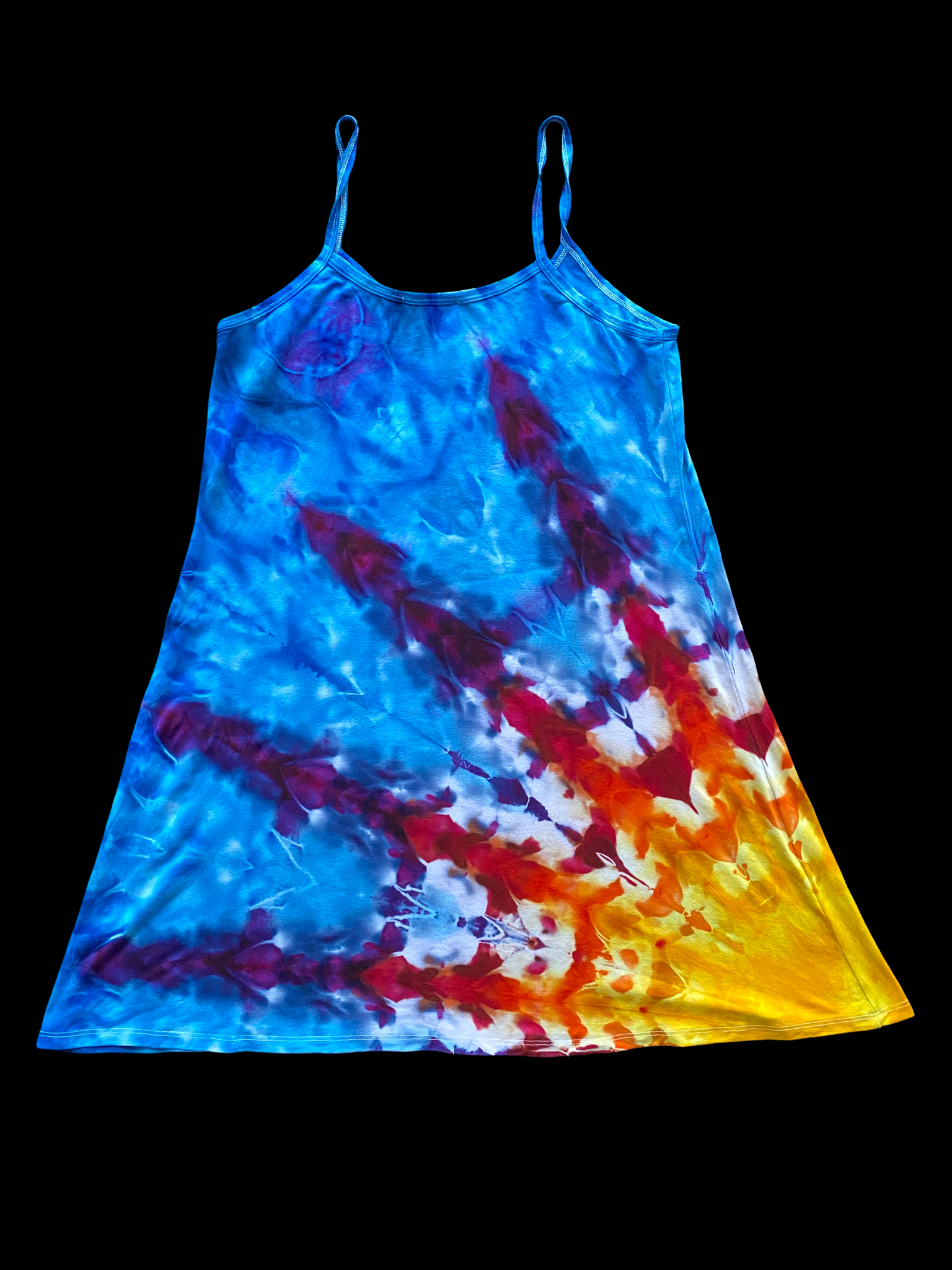 Slipknot Tie Dye beach to dinner ready dress. Soft Rayon, Spaghetti Strap, sunrise